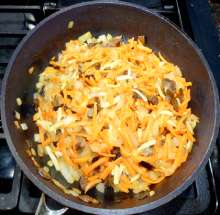 Добавить коренья в сковороду. Жарить до прозрачности лука.