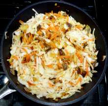 Добавить капусту в сковороду. Потушить несколько минут.