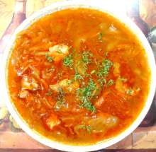 Копченые свиные рёбра, ветчина, копченая говядина, курица, сухие грибы, квашеная капуста, томатный соус. | Варится бульон на говяжьих костях с добавлением копченых свиных рёбер, процеживается, в нём отваривается «мясной набор» (ветчина, копченая говядина, курица). По готовности курицы добавляется зажарка (отваренные сухие грибы, лук, морковь, корень петрушки, квашеная капуста, томат, растительное масло), суп доводится до кипения и снимается с огня. При подаче заправляется чесноком и укропом. |