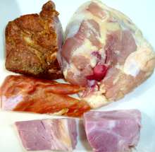 Подготовить мясной набор (у меня – ветчина, копчёная говядина, куриное бедро). Курицу выложить в кастрюлю.