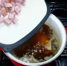 Ветчину и копченую говядину добавить в кастрюлю. Варить до готовности курицы (минут 20).