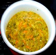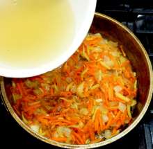 Выложить овощную зажарку в кипящий бульон.