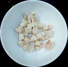 Жареную курицу нарезать небольшими кубиками.