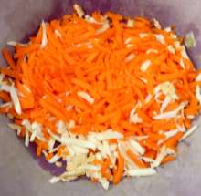Морковь и корень петрушки натереть на крупной тёрке.