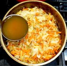 В рецепте Шарова все овощи, включая огурцы, тушатся вместе, а обжаривается только капуста. Но я хотел усилить вкусы предварительной обжаркой кореньев.