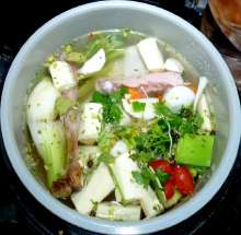 | Жареная курица, квашеная капуста, капустный рассол, сливочное масло. | Из костей курицы варится бульон, процеживается, в него добавляется овощная зажарка (пассерованный лук, морковь, корень петрушки, солёные огурцы, томлёная в сливочном масле квашеная капуста) тушеная в смеси рассола и бульона. Суп заправляется петрушкой и укропом, доваривается до изменения цвета зелени, заправляется чесноком. При подаче в тарелки добавляется жареная курица. |