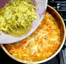 Капусту можно присыпать мукой (так у Левшина), но я не вижу в этом смысла, поскольку загущения и без того густого супа не требуется. С рассолом (капустным, огуречным) нужно быть аккуратным, чтобы не пересолить суп.В рецепте Шарова все овощи, включая огурцы, тушатся вместе, а обжаривается только капуста. Но я хотел усилить вкусы предварительной обжаркой кореньев.