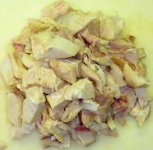 Курицу из бульона нарезать небольшими кубиками.