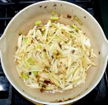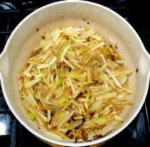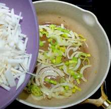 Когда лук станет мягким - добавить белые корнья.