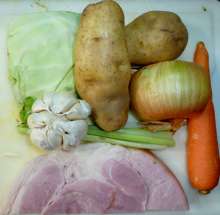 | Куриный бульон, ветчина, фасоль, чеснок. | Нарезанная кубиками ветчина поджаривается, убирается в сторону. На вытопленном жире готовится овощная заправка (лук, морковь, стебель сельдерея), добавляется нарезанный кубиками картофель, овощи заливаются куриным бульоном, возвращается поджаренная ветчина. Через некоторое время добавляется тонко нашинкованная капуста, суп доваривается до готовности картофеля, добавляется откинутая на сито консервированная фасоль, рубленный чеснок, щи доводятся до кипения и снимаются с огня. При подаче заправляется свежей зеленью. |