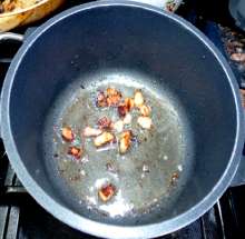 Поджарить ветчину до золотистой корочки, вынуть из кастрюли.