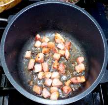 С ветчины срезать жир, нарезать кубиками, выложить в разогретую толстостенную кастрюлю.