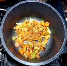 В оригинальном рецепте ветчина жарится вместе с уже готовой овощной заправкой, что странно, ведь за время жарки ветчины овощи пережарятся. Поэтому я разделил эти операции.