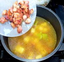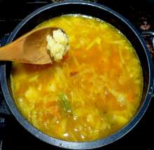 Когда добавлять капусту – зависит от времени года. Летняя капуста варится быстро (10 минут), а вот зимняя – минут 15-20, так что добавлять её нужно вместе с картофелем. Ориентируйтесь также на свои предпочтения – любите ли вы капусту с хрустинкой или мягкую.