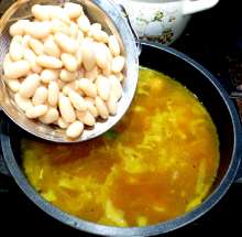 Если у вас свежая, предварительно замоченная фасоль – добавьте её в кастрюлю за 10 минут до окончания варки или следуйте инструкции на упаковке.