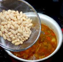 Зелень можно и не варить, если вы собираетесь съесть щи в один день. Если же варите суп на несколько дней – он может скиснуть со свежей зеленью.Консервированную фасоль откинуть на сито.