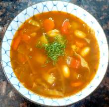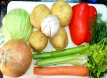 | Репа, помидор, фасоль консервированная, болгарский перец, томатная паста. | Варится бульон из утиных костей, процеживается, в него добавляется картофель, затем – нашинкованная капуста. Щи варятся почти до готовности картофеля, добавляется овощная заправка (пассерованные лук, морковь, стебель сельдерея, сладкий перец с томатом). Суп варится несколько минут, добавляется рубленная зелень, варится до изменения цвета, затем добавляется откинутая на сито консервированная фасоль. Суп доводится до кипения, заправляется рубленным чесноком, выправляется на соль и перец и снимается с огня. Готовые щи настаиваются, при подаче заправляются свежей зеленью и (по желанию) сметаной. |