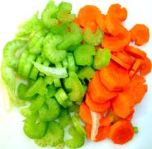 Морковь нарезать шайбами, стебель сельдерея – брусочками поперёк.