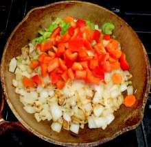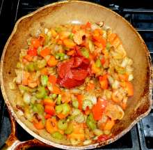 Отодвинуть овощи к краям сковороды, в центр выложить томат. Жарить несколько минут, затем перемешать.