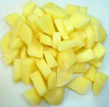 Тем временем картофель нарезать четвертушками, выложить в кипящий бульон.