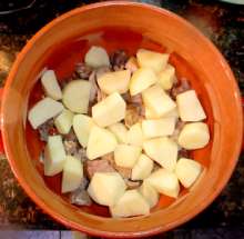 Вынуть горшок из духовки, проверить готовность картофеля. Если не готов – вернуть в печь ещё на 30 минут или томить до готовности картофеля.