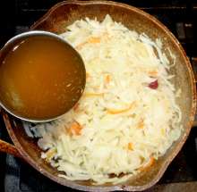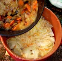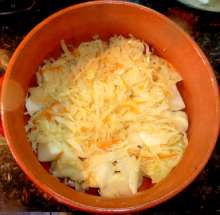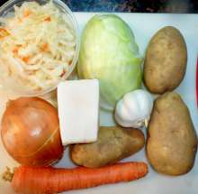 Длительность томления зависит от кислоты капусты – чем она кислее – тем дольше будет готовиться картофель.В оригинальном рецепте чеснок закладывается в самом начале, однако я не вижу в этом смысла – при длительном томлении аромат чеснока полностью исчезнет.