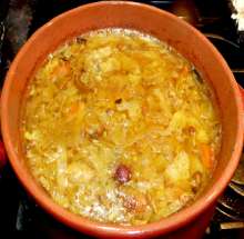 | Сочетание курицы, говядины, свинины, мясной бульон, сало, мука, чеснок. | Варится крепкий бульон из говядины, свинины, курицы, процеживается. В керамический (чугунный) горшок выкладываются слоями мясо из бульона, картофель, тушеная с маслом квашеная капуста, мучная заправка (поджаренный на сале лук, морковь, мука, бульон), свежая капуста. Ингредиенты заливаются процеженным бульном, щи томятся под крышкой в духовке 3-4 часа при периодическом снижении температуры, имитирующем остывающую русскую печь. По говности заправляются рубленным чесноком и зеленью. |