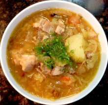 Это красивые, нажористые щи с богатой палитрой вкусов. Основные фишки – крепкий бульон на разных видах мяса с курицей, мучная заправка на сале, сочетание квашеной и свежей капусты.