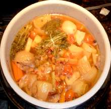 Поставить горшок в духовку, нагретую до 180 С. Через 30 минут снизить температуру до 140 С, готовить 2 часа. Затем снизить температуру до 130 С, готовить 30 минут.