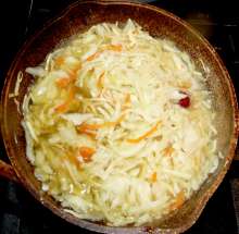 Квашеную капусту промыть, если слишком кислая, выложить в нагретую сковороду с растительным маслом.