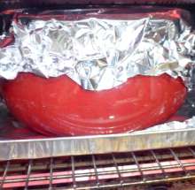 Поставить горшок в духовку, нагретую до 180 С. Через 30 минут снизить температуру до 140 С, готовить 2 часа. Затем снизить температуру до 130 С, готовить 30 минут.