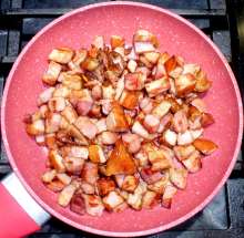 В оригинальном рецепте копчёности не поджариваются, но поджаривание многократно интенсифицирует их вкус.
