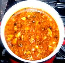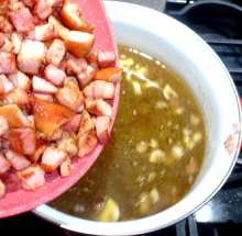 Вернуть в кастрюлю остывшее и нарезанное мясо. Убавить огонь, варить, пока не будут готовы остальные ингредиенты.