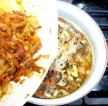 В оригинальном рецепте копчёные рёбра при варке бульона не используются, но их добавление придаёт бульону особенный аромат.