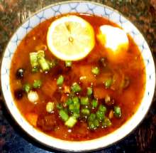 Солёные и свежие грибы, копчёные свиные рёбра. В процеженном мясном бульоне отвариваются свежие грибы, добавляются поджаренные копчености, луковая зажарка с солёными огурцами и томатом, а в конце варки - солёные грибы, маслины и каперсы.
