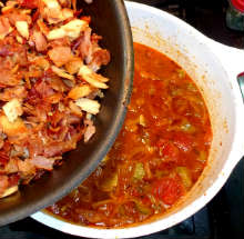 Вынуть поджаренный бекон, в казан выложить лук.