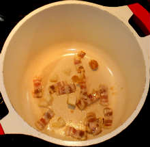 В разогретый толстостенный казан выложить кусочки бекона.