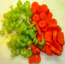 Морковь нарезать шайбами, стебель сельдерея - брусочками.