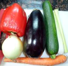 Кабачек, болгарский перец, баклажан, фасоль, лимон, горчица, сахар. Овощи (лук, морковь, стебель сельдерея, кабачек, болгарский перец, баклажан) обжариваются в растительном масле, картофель и капуста отвариваются в овощном бульоне, добавляются обжаренные овощи, а по готовности картофеля – тушеная с томатом свекла. По готовности борщ заправляется горчицей и чесноком, а при подаче – свежей зеленью.