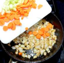 Когда лук станет прозрачным – выложить морковь и сельдерей в сковороду.