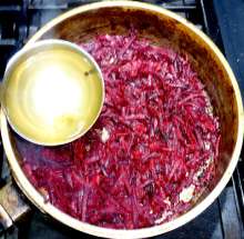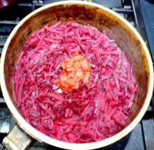 В оригинальном рецепте свекла тушится вместе с остальными овощами, но она требует гораздо больше времени для тушения, чем остальные овощи, и в результате либо свекла останется сырой, либо остальные овощи растушатся в кашу.