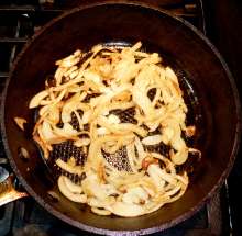 Поджарить лук до легкой корочки.