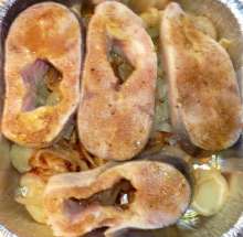 Картофель, помидоры, зеленый перец, паприка, чеснок. В смазанную маслом форму последовательно выкладываются кружочки сваренного до полуготовности картофеля, поджаренный лук, предварительно подмаринованные стейки рыбы, кружки сладкого зеленого перца, ломтики помидор. Блюдо спрыскиается оливковым маслом и запекается под грилем до готовности рыбы. При подаче посыпается рубленной зеленью.