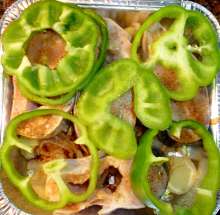 В нарезке перца я следовал рецепту и собственным воспоминаниям, но лучше резать его полукольцами – так можно уложить его больше.