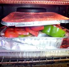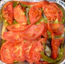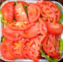 Покрыть перец полукружьями помидор. Посолить, поперчить, сбрызнуть оливковым маслом.