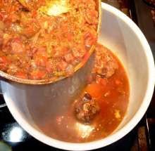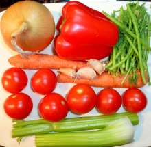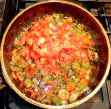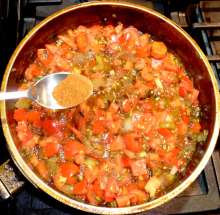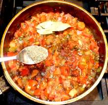 Чеснок, болгарский перец, помидоры, красное вино, говяжий бульон, паприка, тимьян, розмарин. Звенья хвостов обжариваются с двух сторон на оливковом масле, выкладываются в контейнер мультиварки, заливаются соусом (поджаренные лук, чеснок, стебель сельдерея, сладкий перец, помидоры, стебли зелени, красное вино, говяжий бульон, сухие травы и специи) и готовятся под давлением 1 час при минимальной температуре.