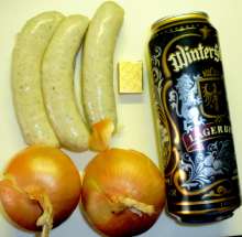 | Пиво, сахар, жареный лук. | В форму для запекания наливается луковая подливка (пассерованный с сахаром лук со специями, тушеный в мясном бульоне с добавлением муки), поверх выкладываются колбаски, доливается светлое пиво и блюдо запекается 35 минут при 200 С. |