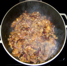 | Соленые огурцы, обжаренная картошка | Мясо обжаривается в масле, смешивается с жареным луком и тушится с огурцами и томатом. В конце к мясу добавляется обжаренная до полуготовности картошка и блюдо тушится до готовности. |
