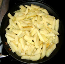 Тем временем нарезать картофель брусочками, выложить на разогретую сковороду с растительным маслом.