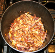 Обжарить мясо на сильном огне до золотистой корочки.